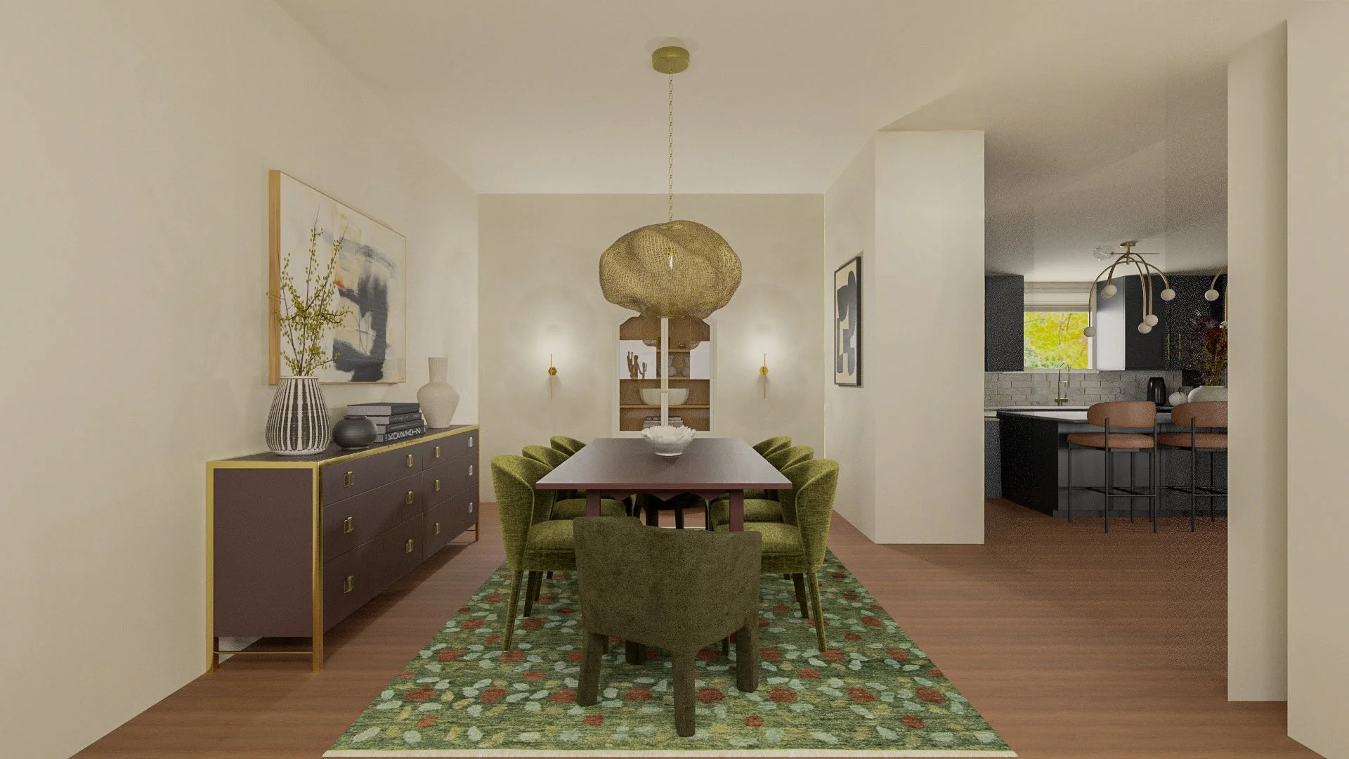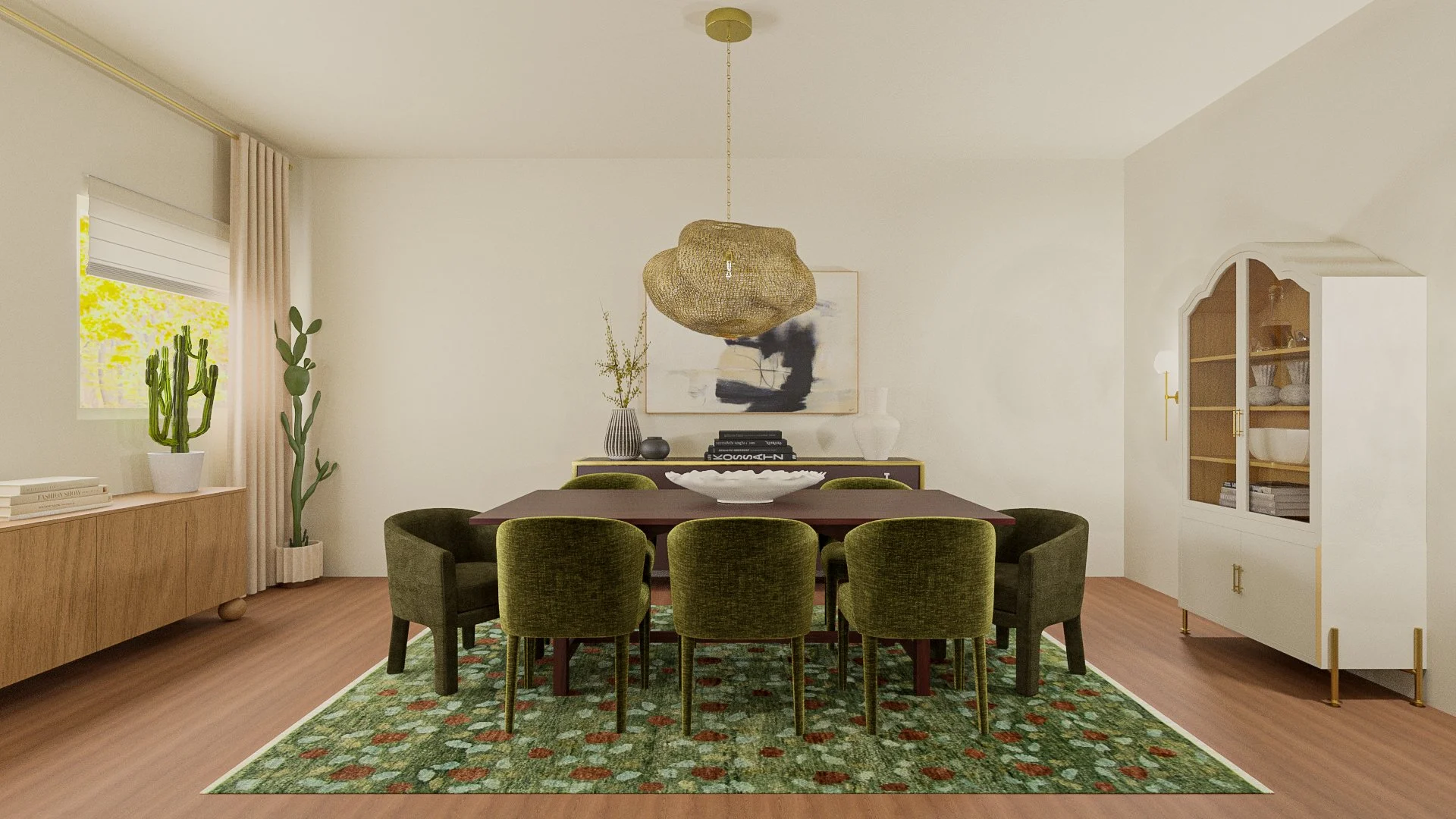 Anchoring around the heirloom of a client’s in a dining room table handed down for generations we layered in shades of green and burgundy, whimsical geometric forms, statement lighting and artwork for a room that has layers upon layers of style and personality.