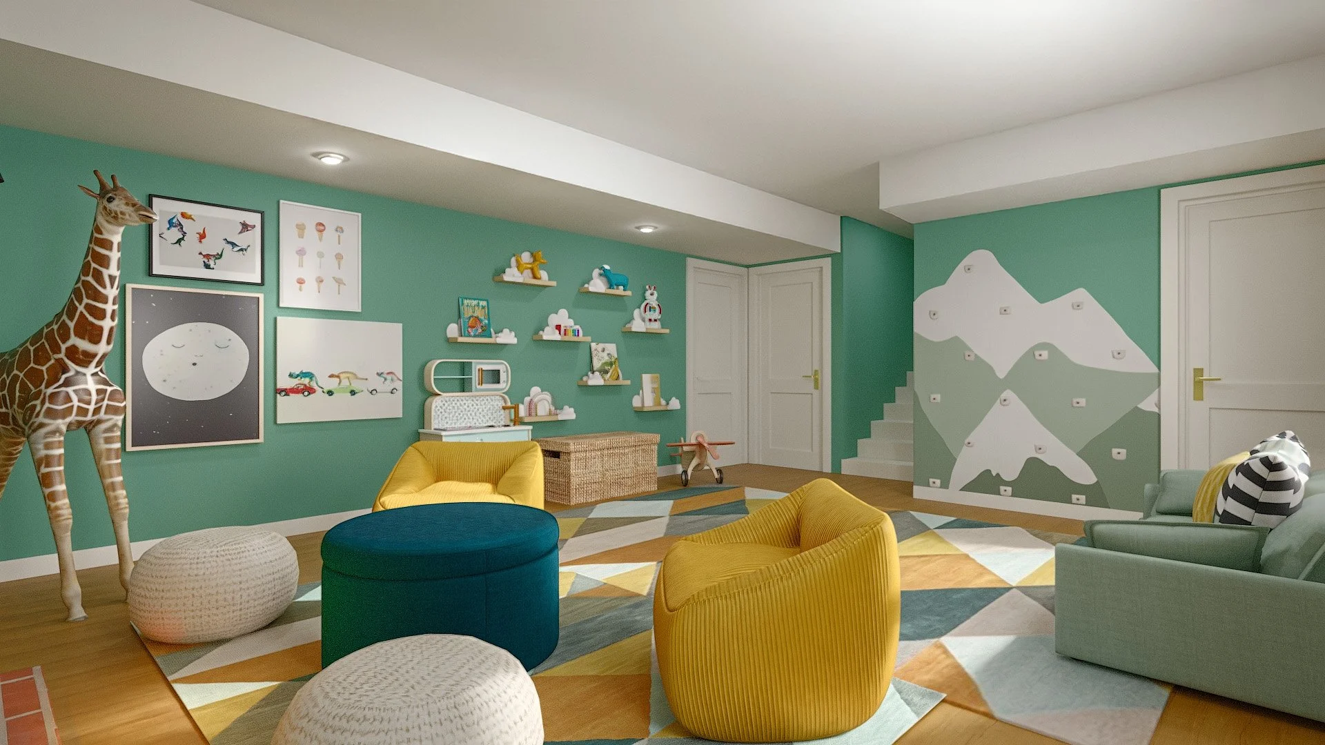 This playroom just makes you want to be a kid again! The graphic wallpaper and brilliantly colored geometric patterned rugs pair with the seafoam-toned walls and the terracotta of the brick and curtains together in such a cozy way. This room pulls double duty as a cozy family den and playroom - complete with a transformable couch perfect for forts and sleepovers!