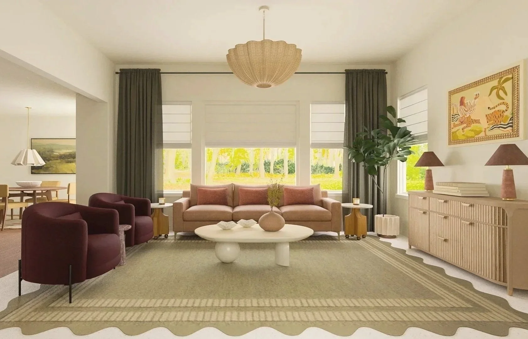 Design concept for a Denver living room refresh project centered on comfort and livability. Rich jewel and earth tones with midcentury modern forms and vintage touches create a grounded, inviting space. Sculptural lighting and curated accessories add visual interest without feeling forced.