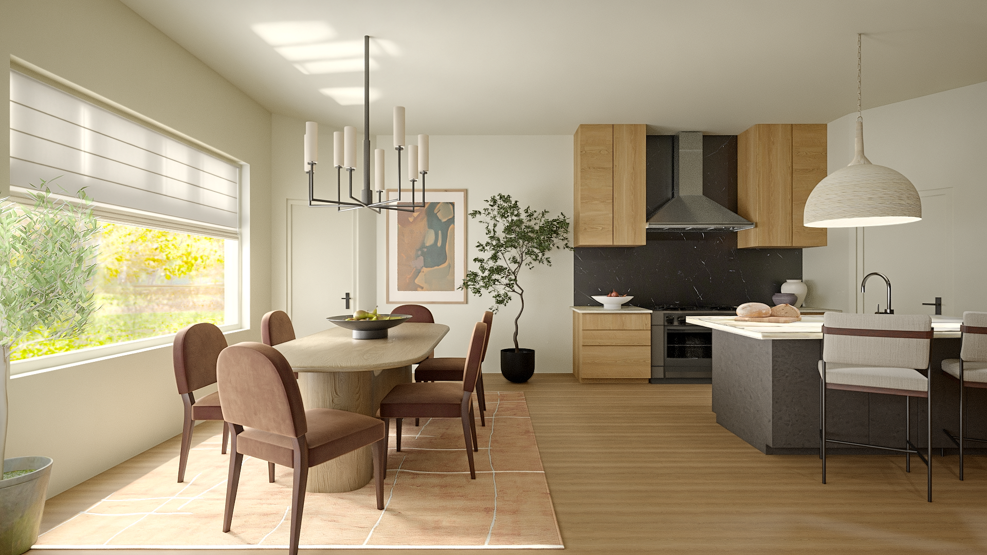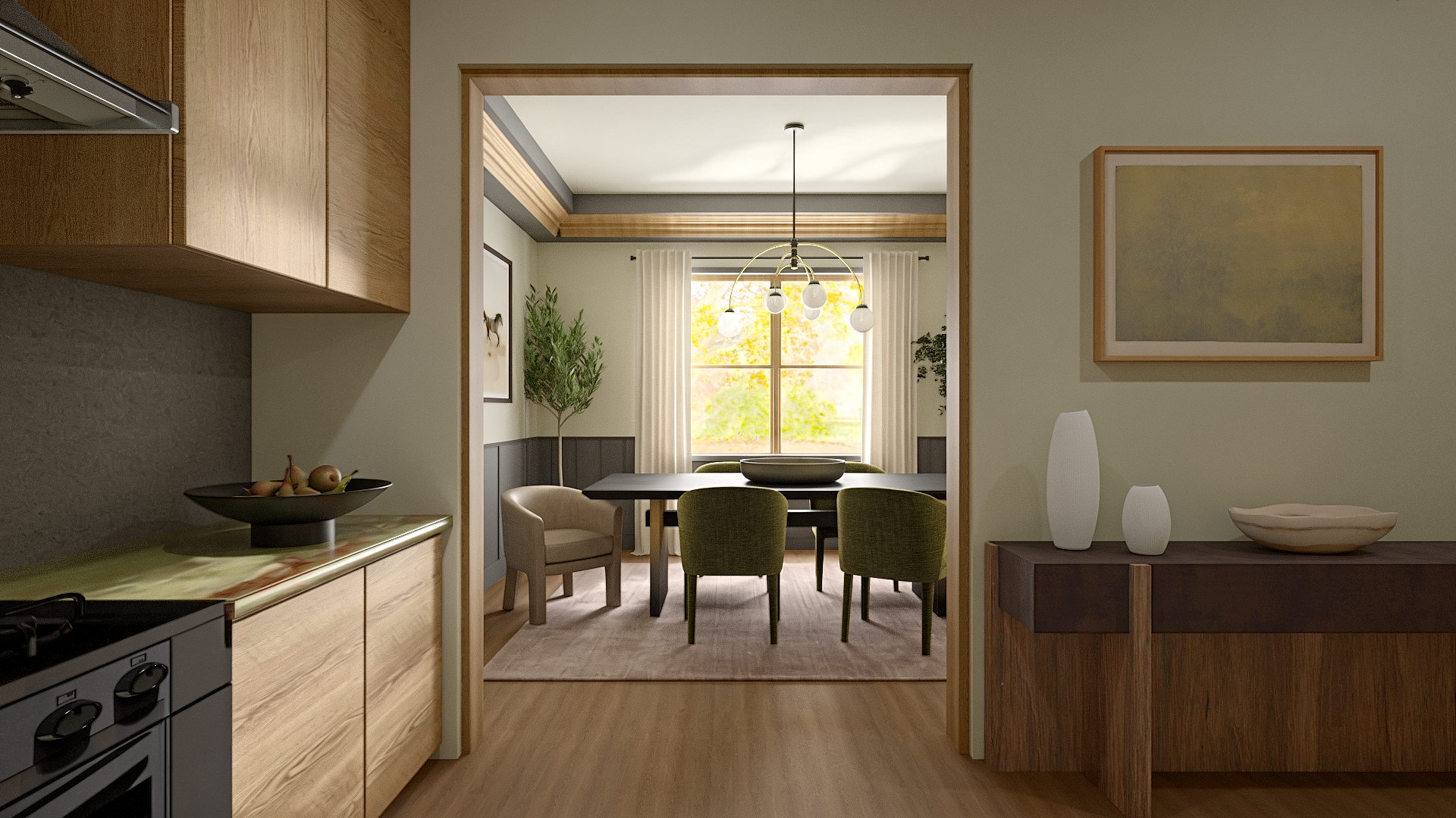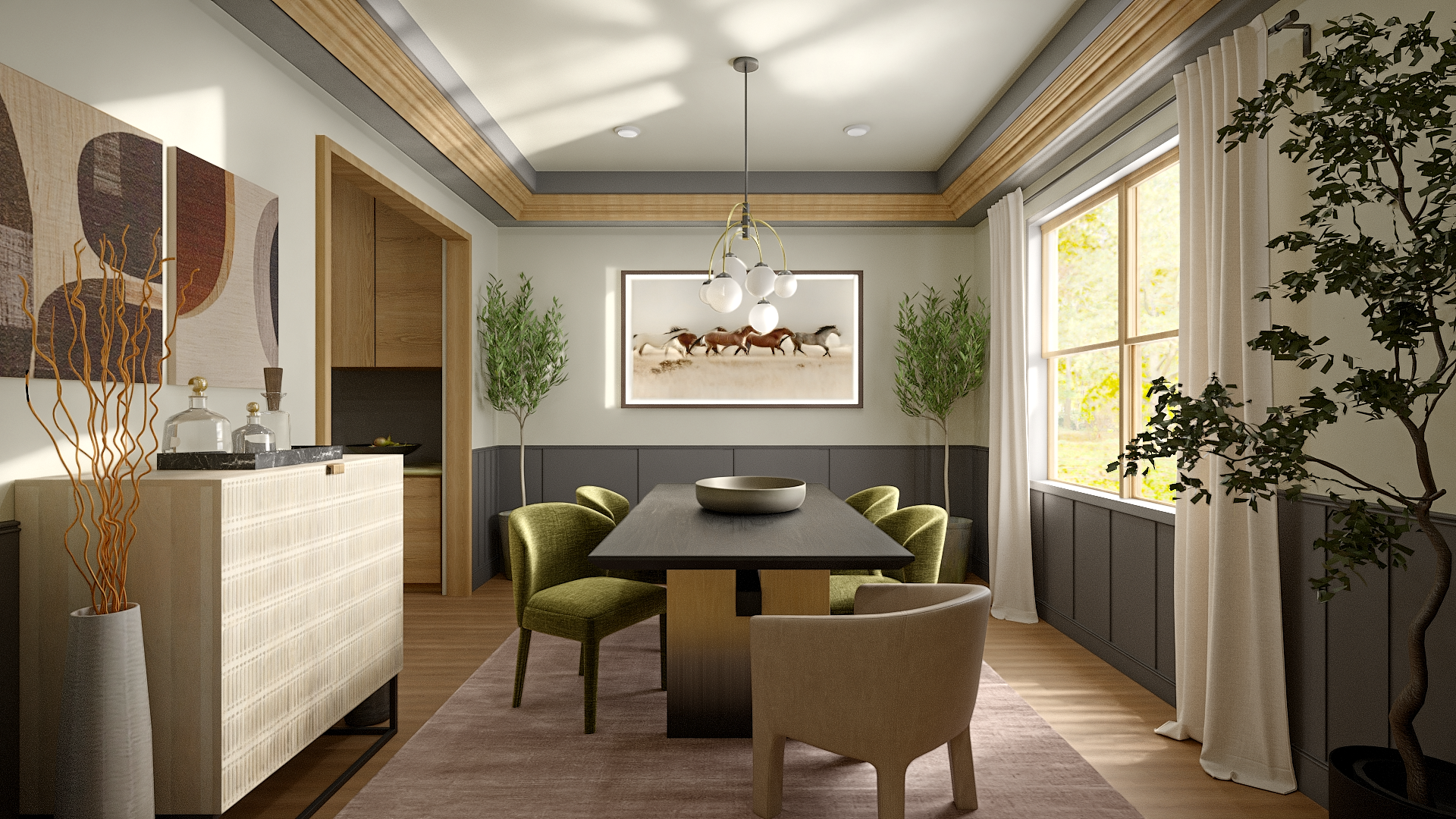 Drawing from the themes in the main room, we pulled in stunning mocha and terracotta for the dining arrangement in the kitchen along with black marble for the backsplash, flat slab weathered wood cabinetry and green quartzite countertops. The dining room got a glow up in green velvet with stone leather at the table heads, and ombre brass base for the stunning black table.